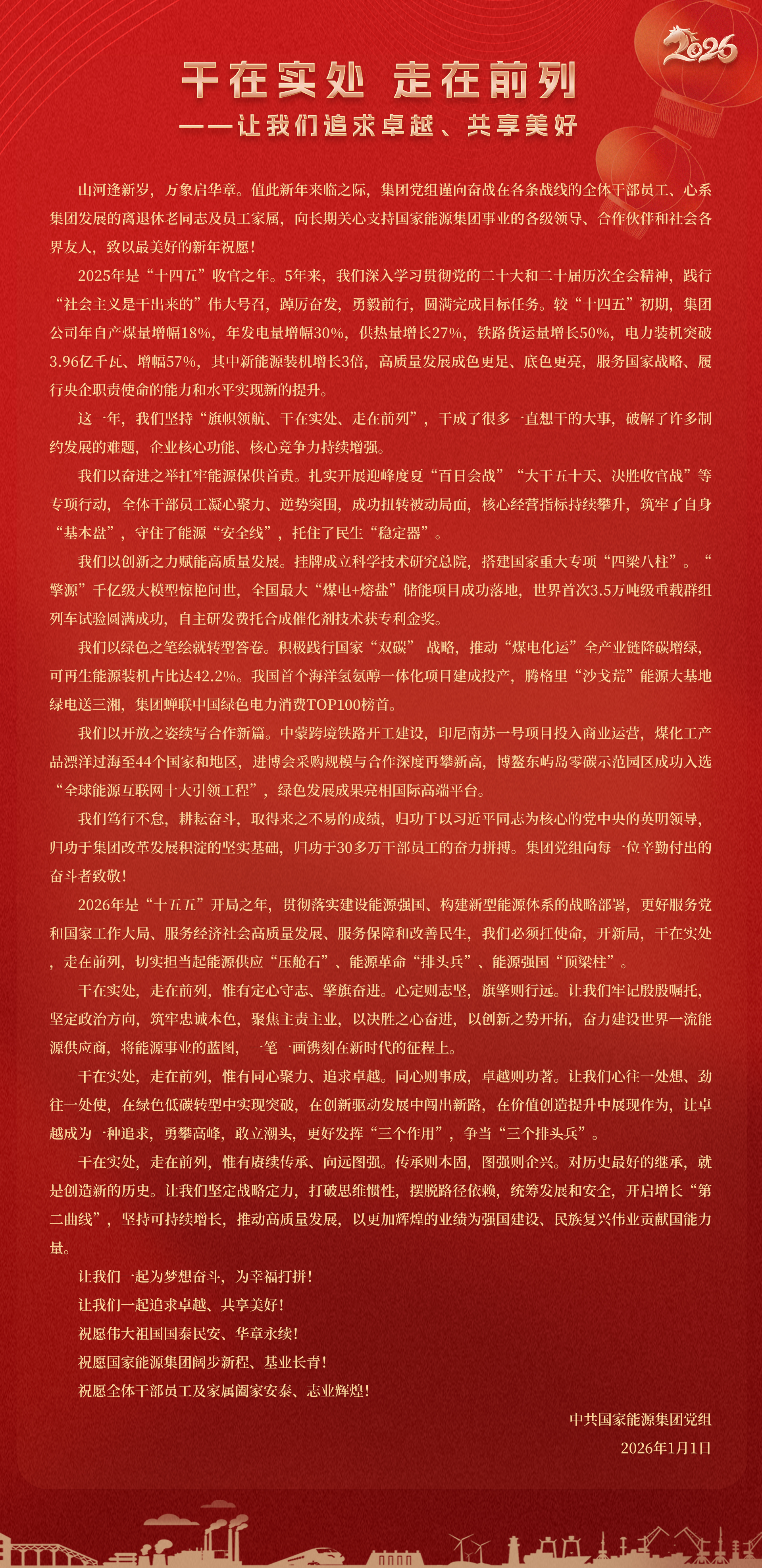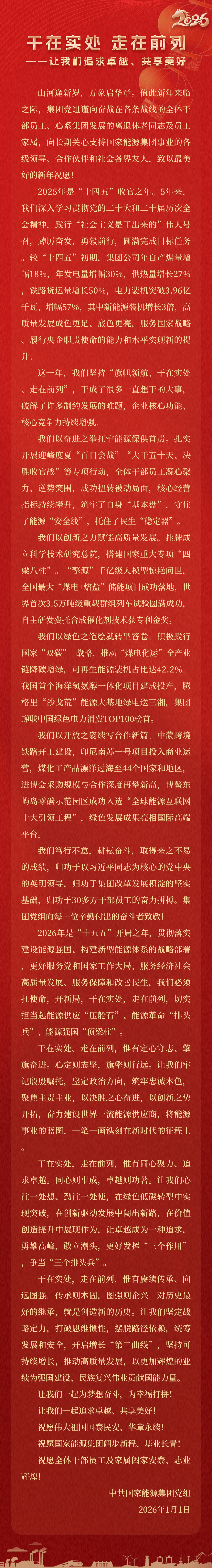 國家能源集團胸懷“國之大者”,增產(chǎn)增供、穩(wěn)價穩(wěn)市,積極服從服務(wù)國家戰(zhàn)略、保障國家能源安全、助力國民經(jīng)濟穩(wěn)增長,推動煤炭安全綠色智能、煤電清潔高效穩(wěn)定、現(xiàn)代煤化工高端多元低碳、運輸物流協(xié)同一體、新能源多元創(chuàng)新規(guī)?;l(fā)展,全力擔當能源強國頂梁柱,能源供應(yīng)壓艙石,能源革命排頭兵。